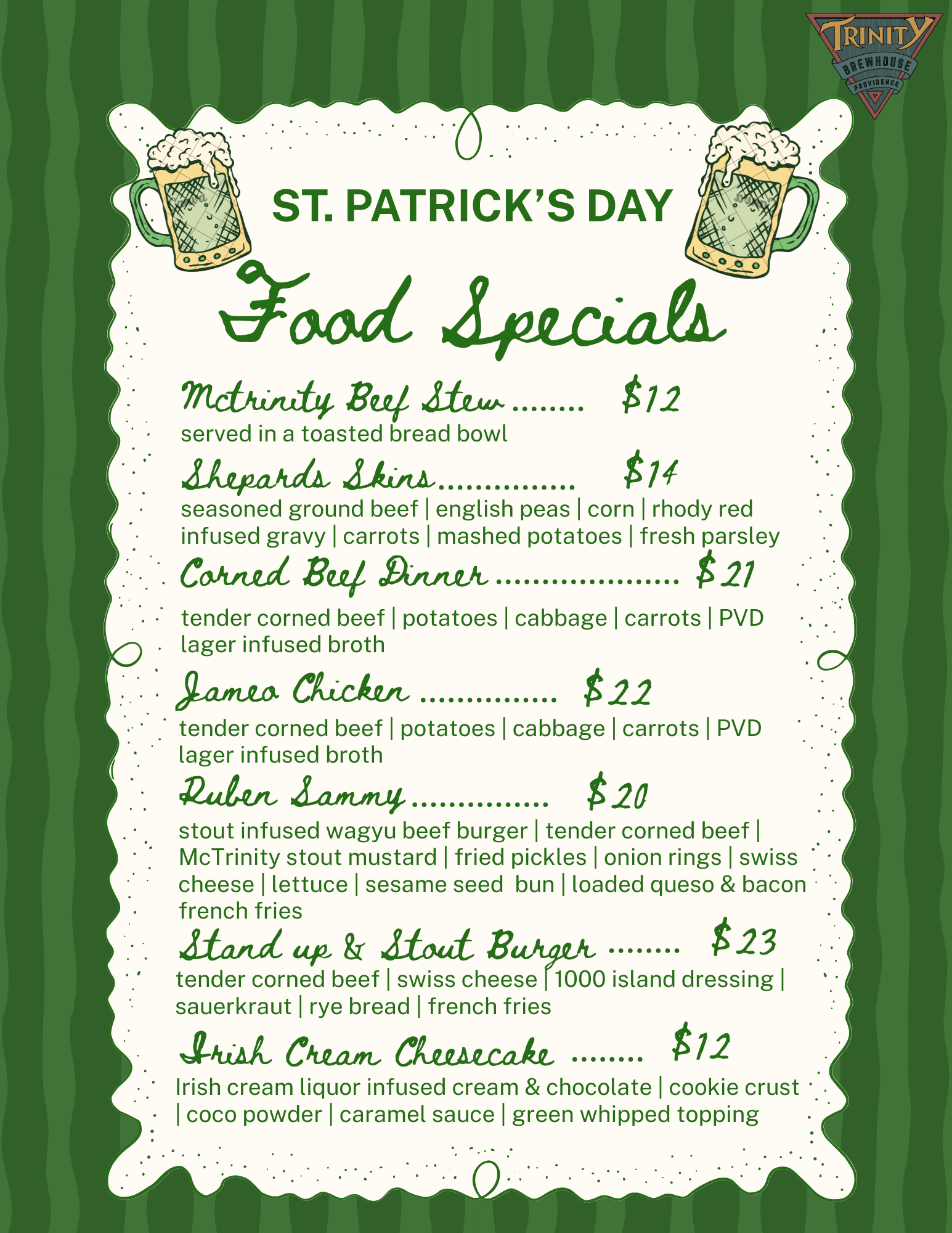 Our beers, brewed on-site under the name Trinity Beer Co., are proudly crafted and distributed locally to retail shops, liquor stores, and restaurants. Our flagship brew, Downcity Haze, is a smooth and juicy Hazy IPA that captures the spirit of Providence in every sip. Our second new beer, PVD Lager, is light, crisp, and easy-drinking, with gentle earthy and floral notes from Saaz hops.